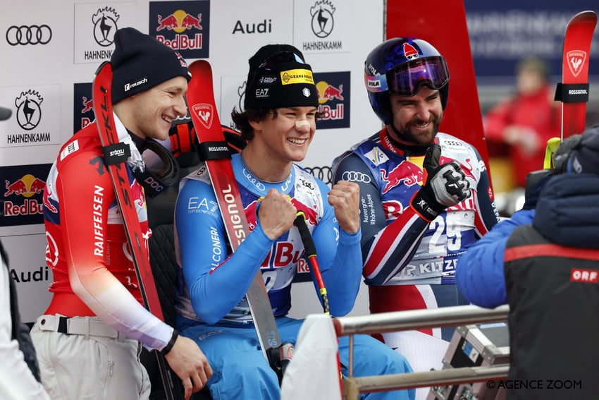 Giovanni Franzoni entourés par Marco Odermatt 2e et Maxence Muzaton 3e de la descente de Kitzbuhel – Photo copyright Agence Zoom/Christophe Pallot