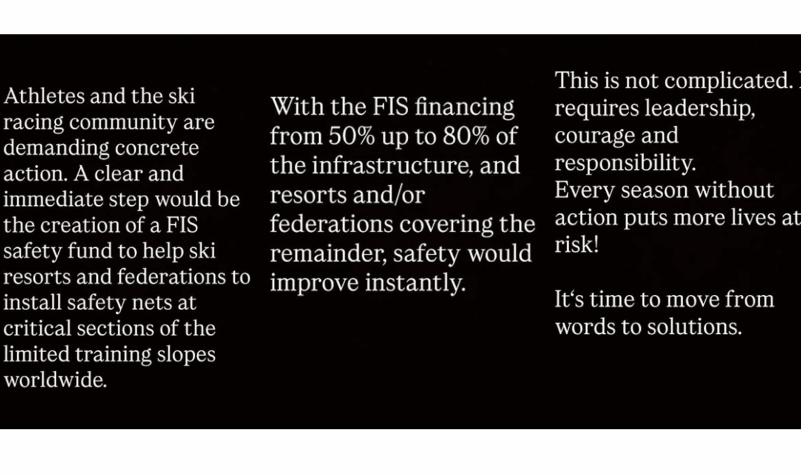 Buechel souligne que les athlètes, ainsi que l’ensemble de la communauté du ski alpin, réclament des mesures concrètes. Il propose notamment la création urgente d’un « Fonds pour la sécurité de la FIS », destiné à aider les organisateurs et les fédérations nationales à installer des filets de protection dans les zones critiques des pistes d’entraînement.